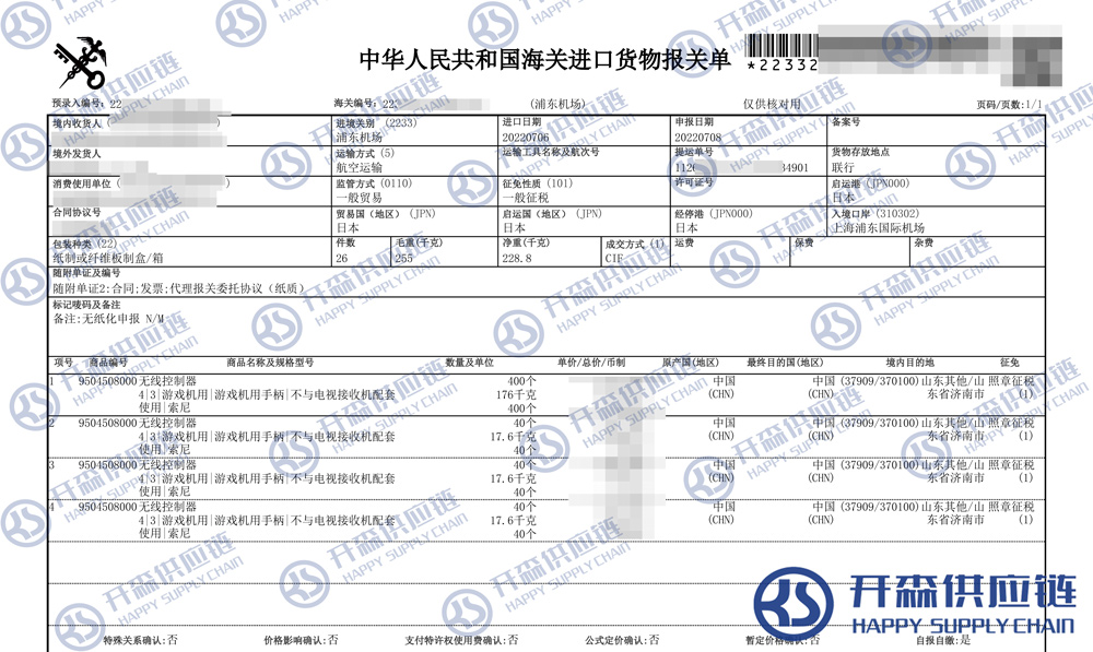 【本文結語】 上述就是日本游戲手柄進口清關報關代理服務【經典案例】的全部內容,希望能對您有所幫助,如有游戲機進口報關上任何疑問及問題可隨時在線聯系我們或撥打 18002611553,開森供應鏈擁有豐富的游戲機進口報關操作經驗及案例,10余年進口經驗為您所用,各類進口疑難都能為您一一解答及協助快速處理解決!