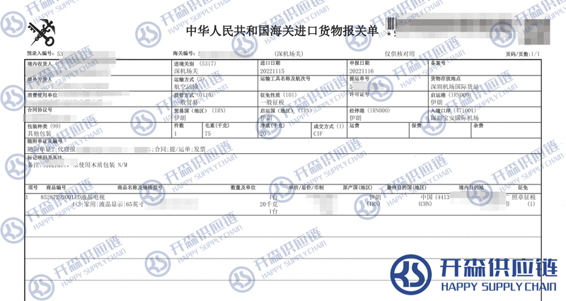 【本文結(jié)語】 上述就是深圳機場LED液晶電視進口報關代理服務【經(jīng)典案例】的全部內(nèi)容,希望能對您有所幫助,如有深圳進口清關上任何疑問及問題可隨時在線聯(lián)系我們或撥打 18002611553,開森供應鏈擁有豐富的深圳進口清關操作經(jīng)驗及案例,10余年進口經(jīng)驗為您所用,各類進口疑難都能為您一一解答及協(xié)助快速處理解決!